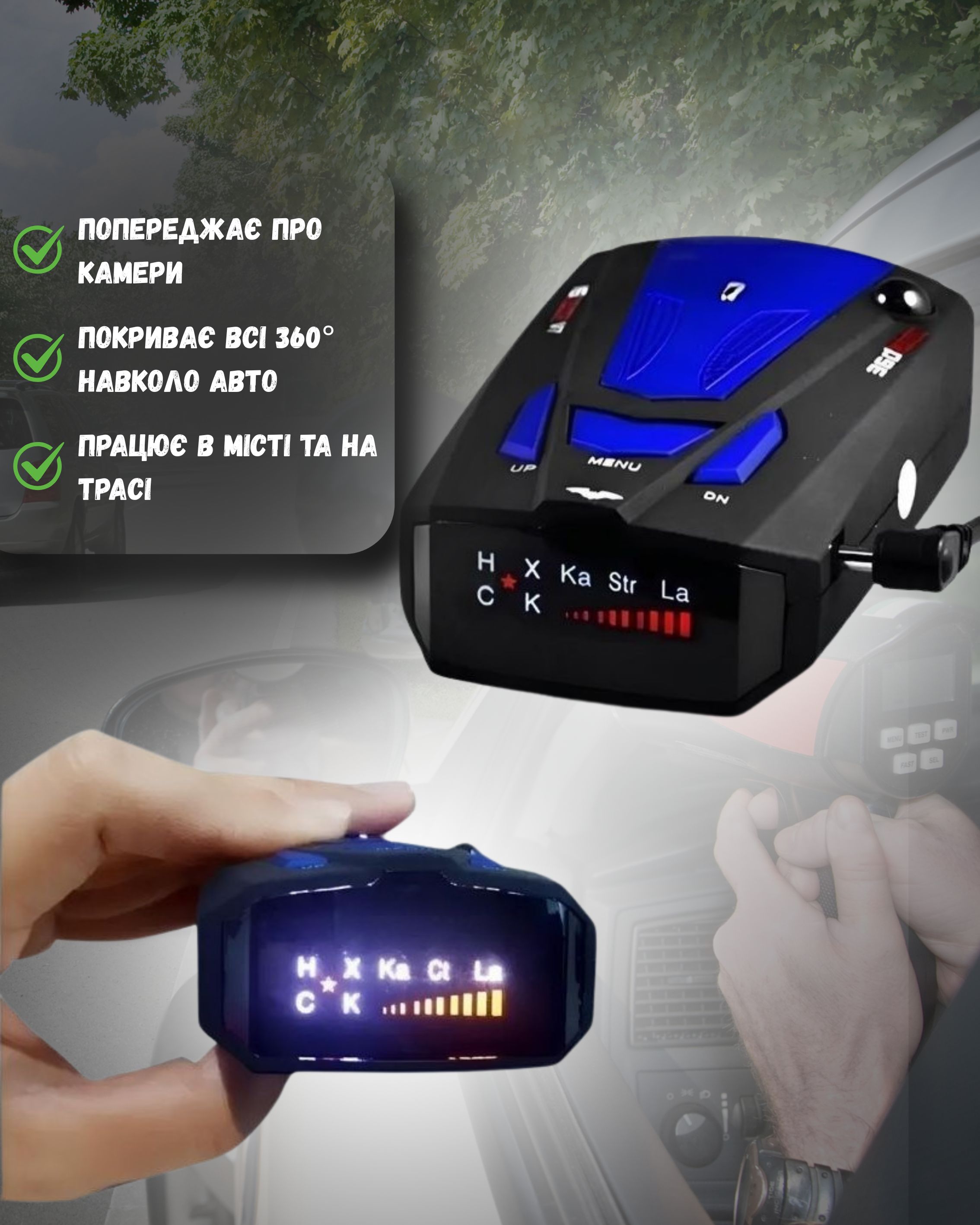 Розпродаж – попереджає про камери за 800 мПрофесійний антирадар — це ваш захист від штрафів та зайвих нервів на дорозі. Він виявляє радари та камери за 200–800 метрів до об'єкта та попереджає сигналом або голосом. Підходить для використання як у місті, так і на трасі, просто оберіть потрібний режим. Працює з українськими та міжнародними радарами (включно з TruCam і лазерними установками). Покриття 360°, ви дізнаєтесь про камеру, навіть якщо вона ззаду або збоку. Звикнете до сигналів і зможете відрізнити хибних камер від справжніх за звуком. 💡 Після кількох днів ви вже будете ""читати"" цей радар інтуїтивно, як досвідчений водій.